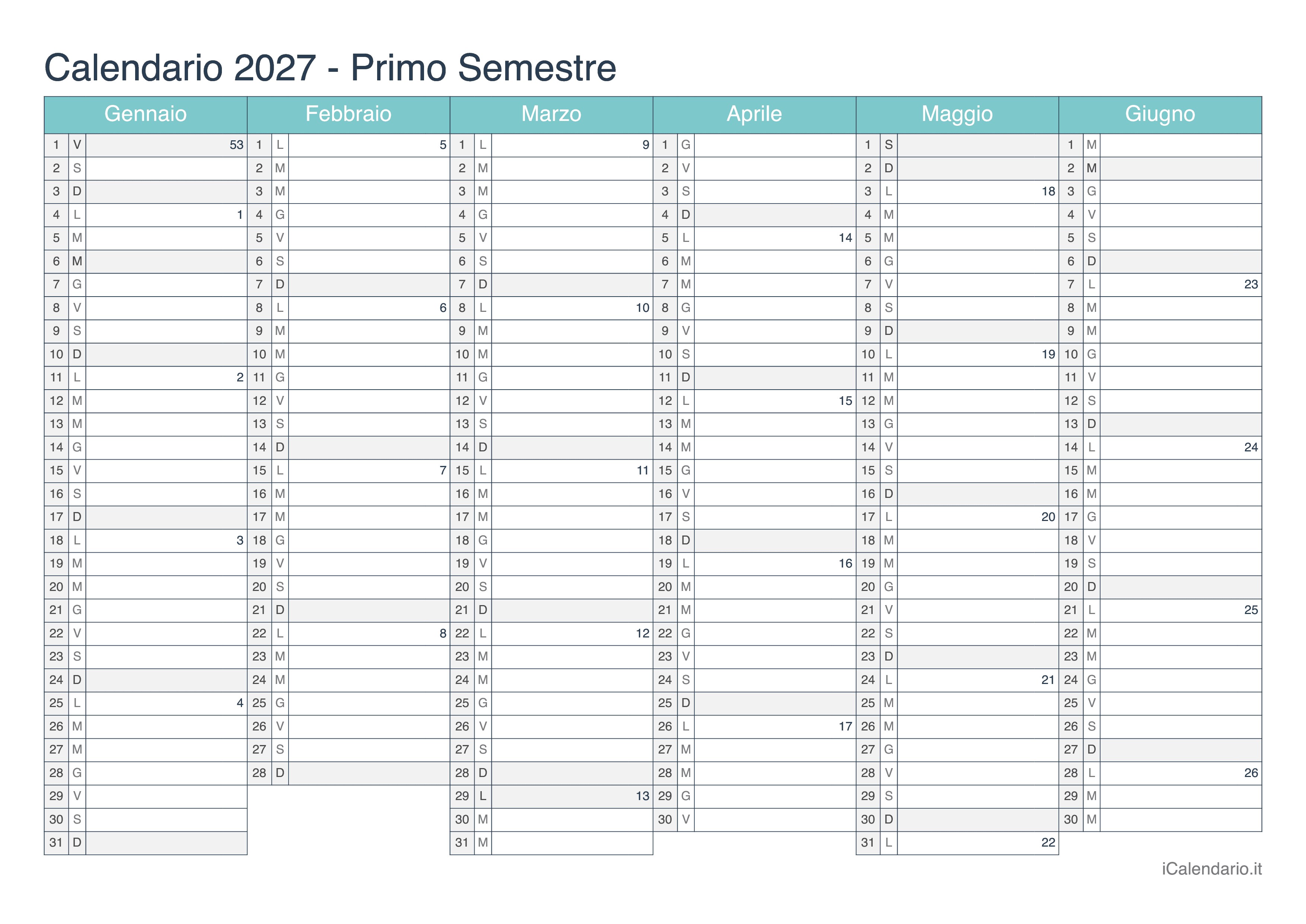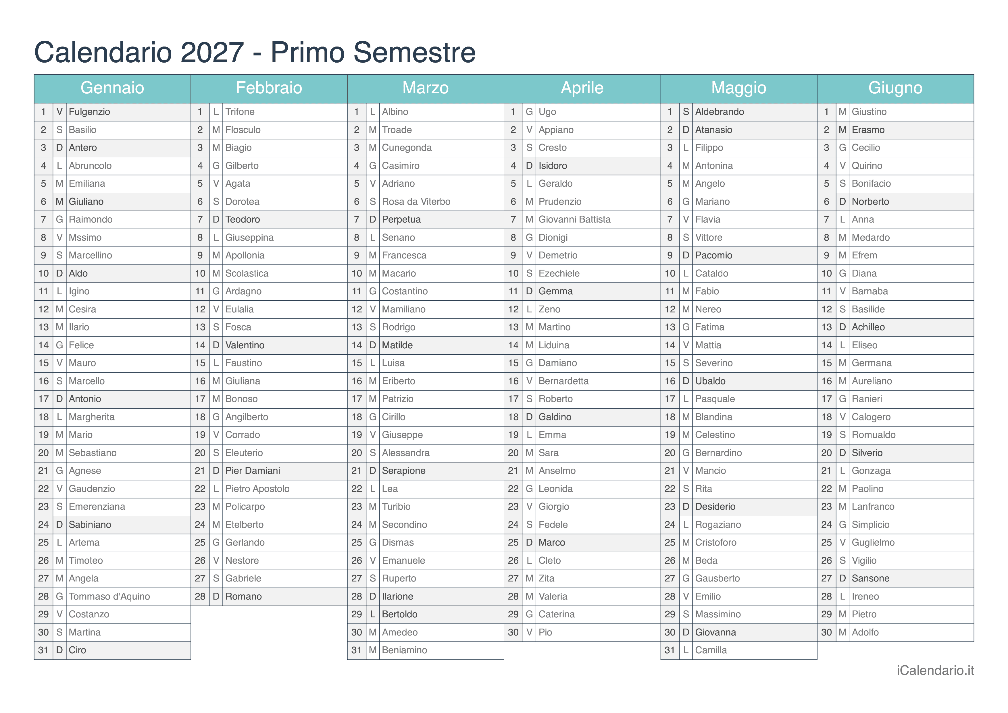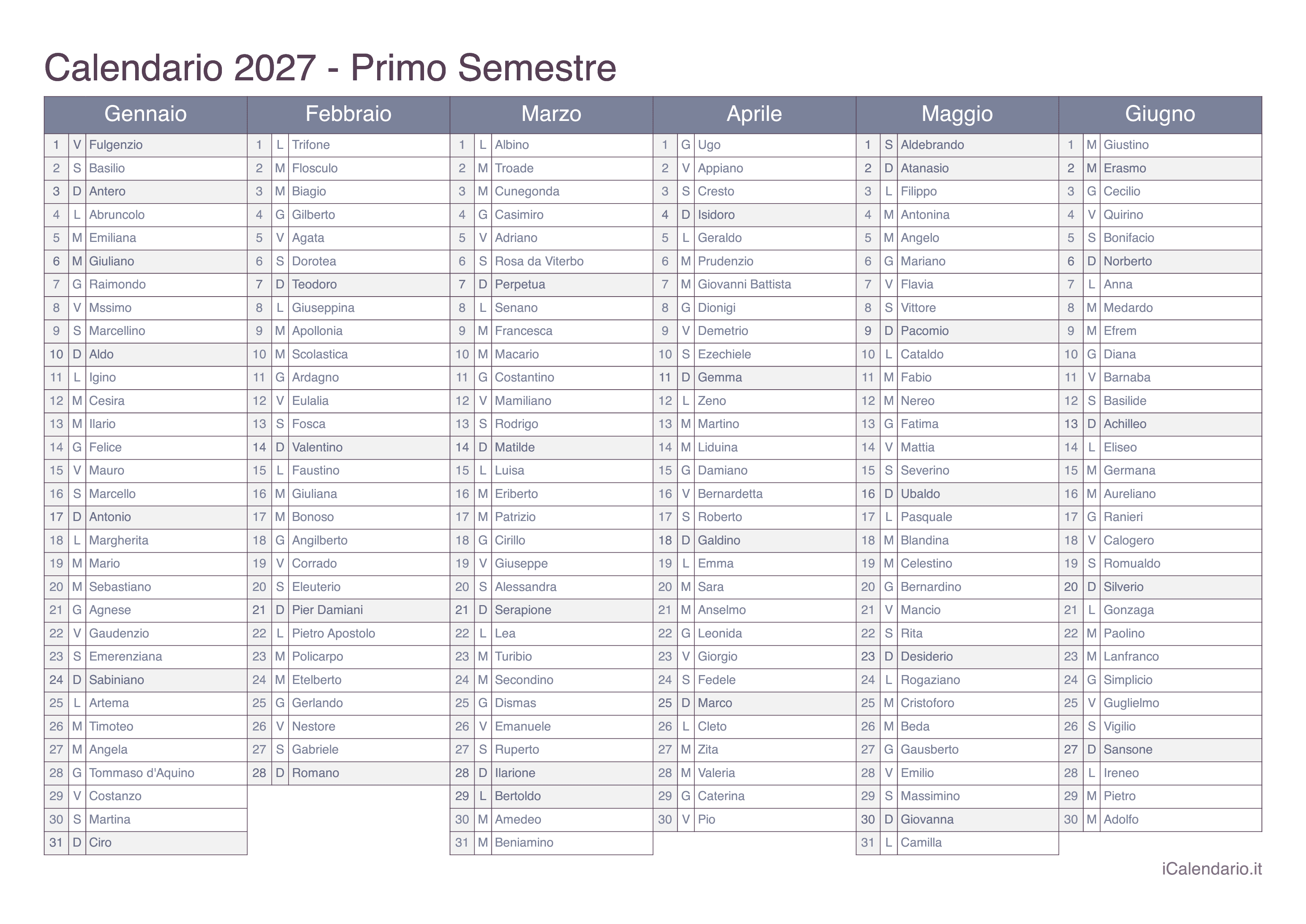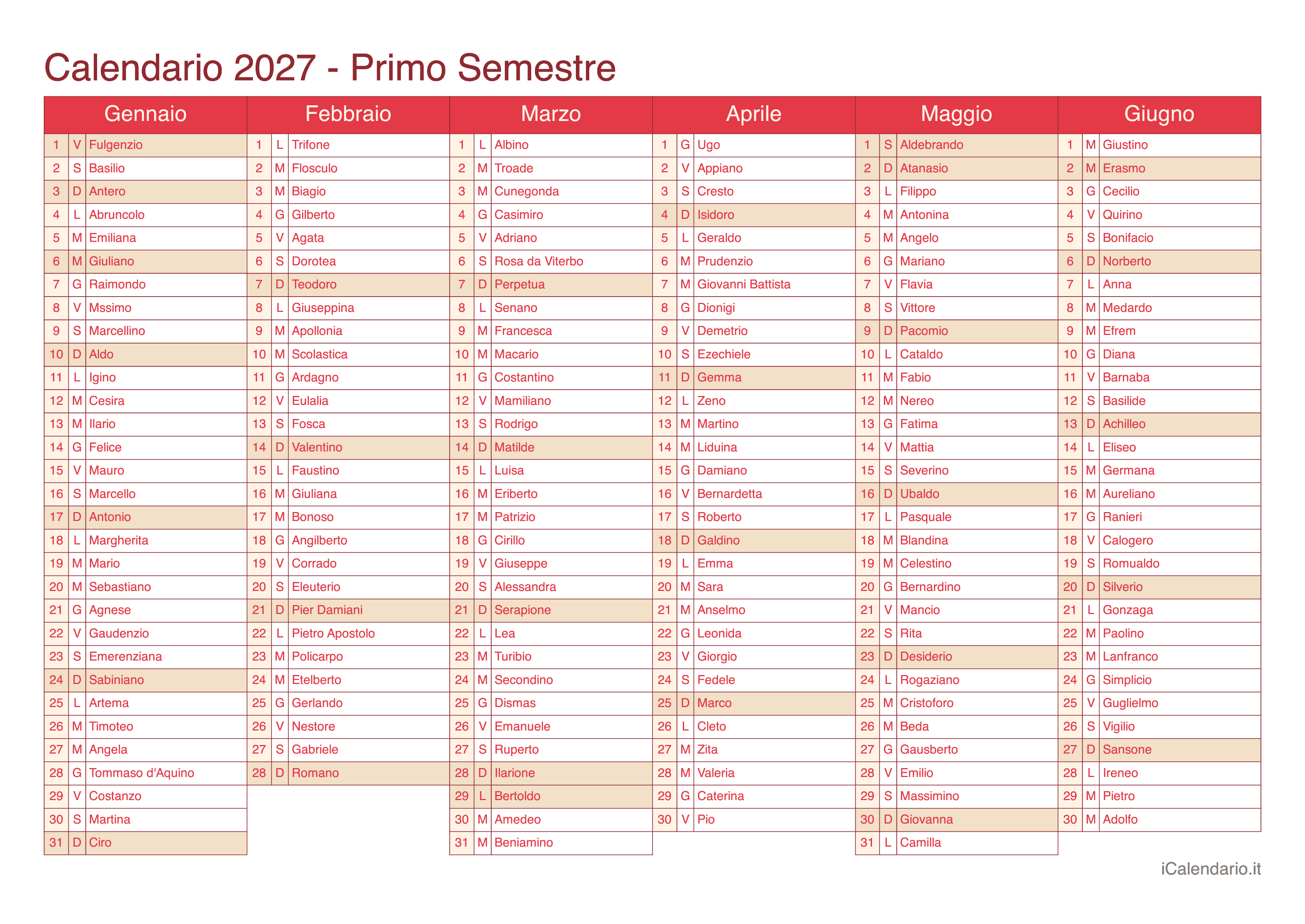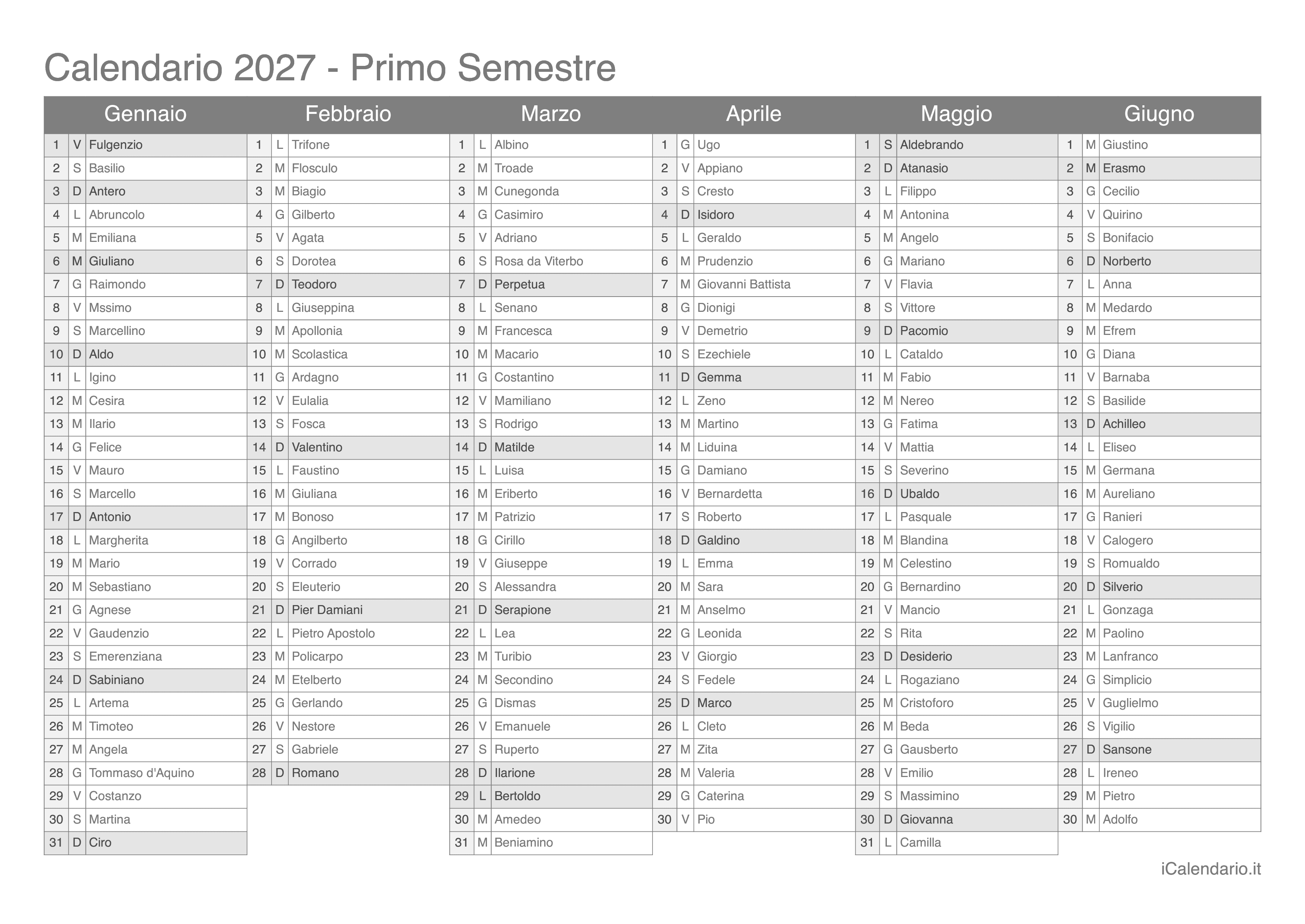 Calendario semestrale 2027