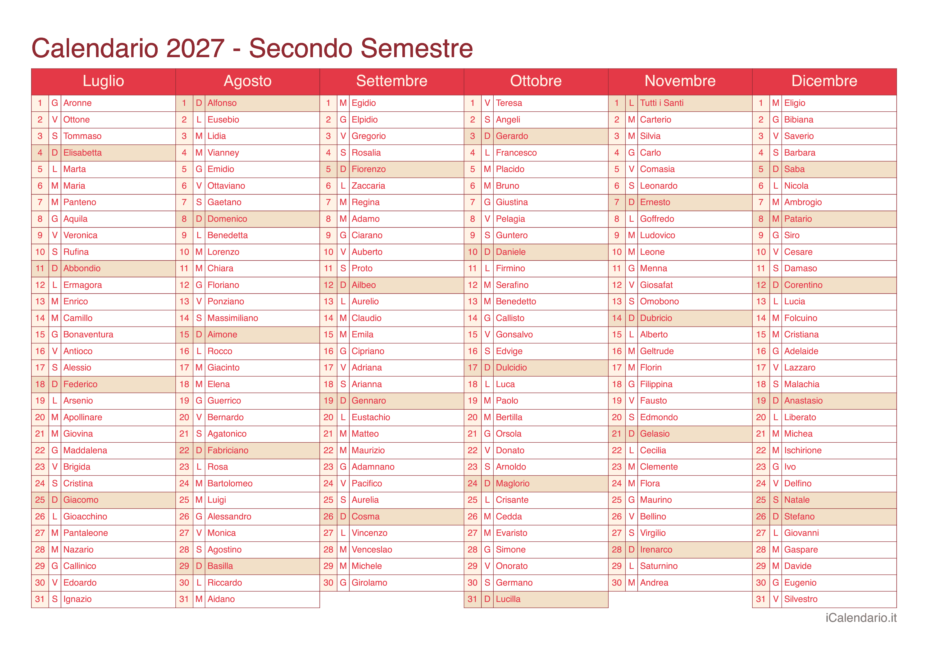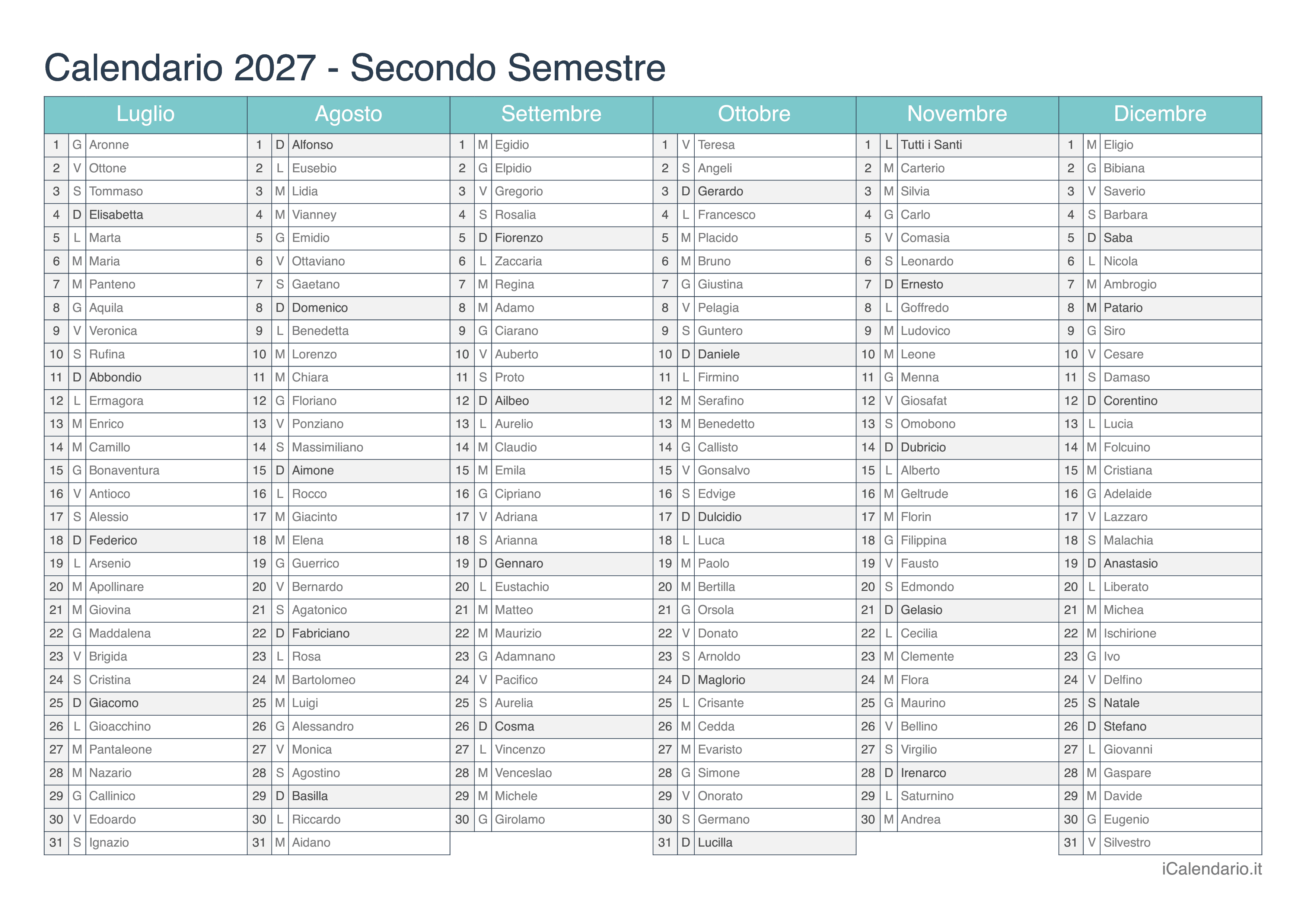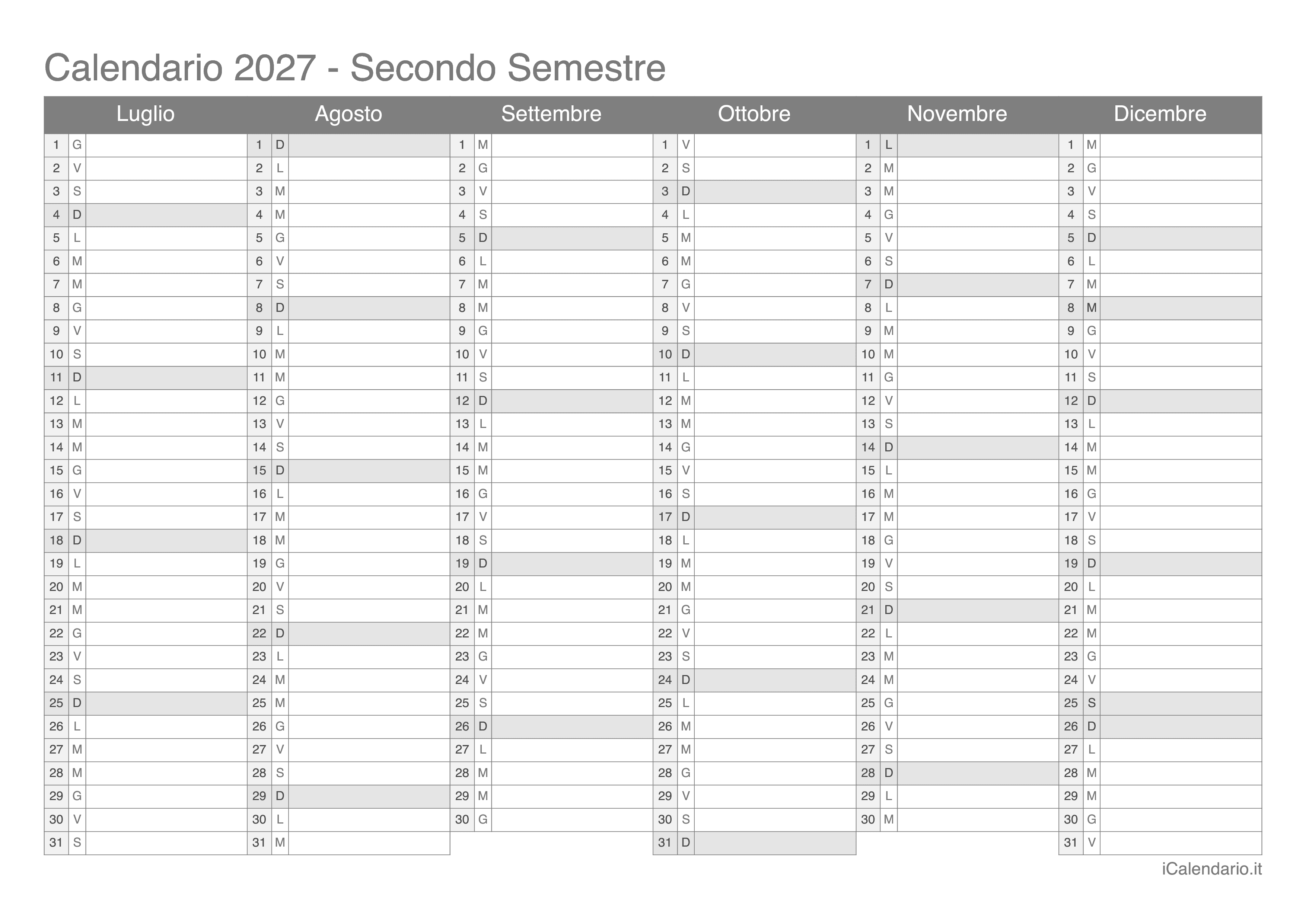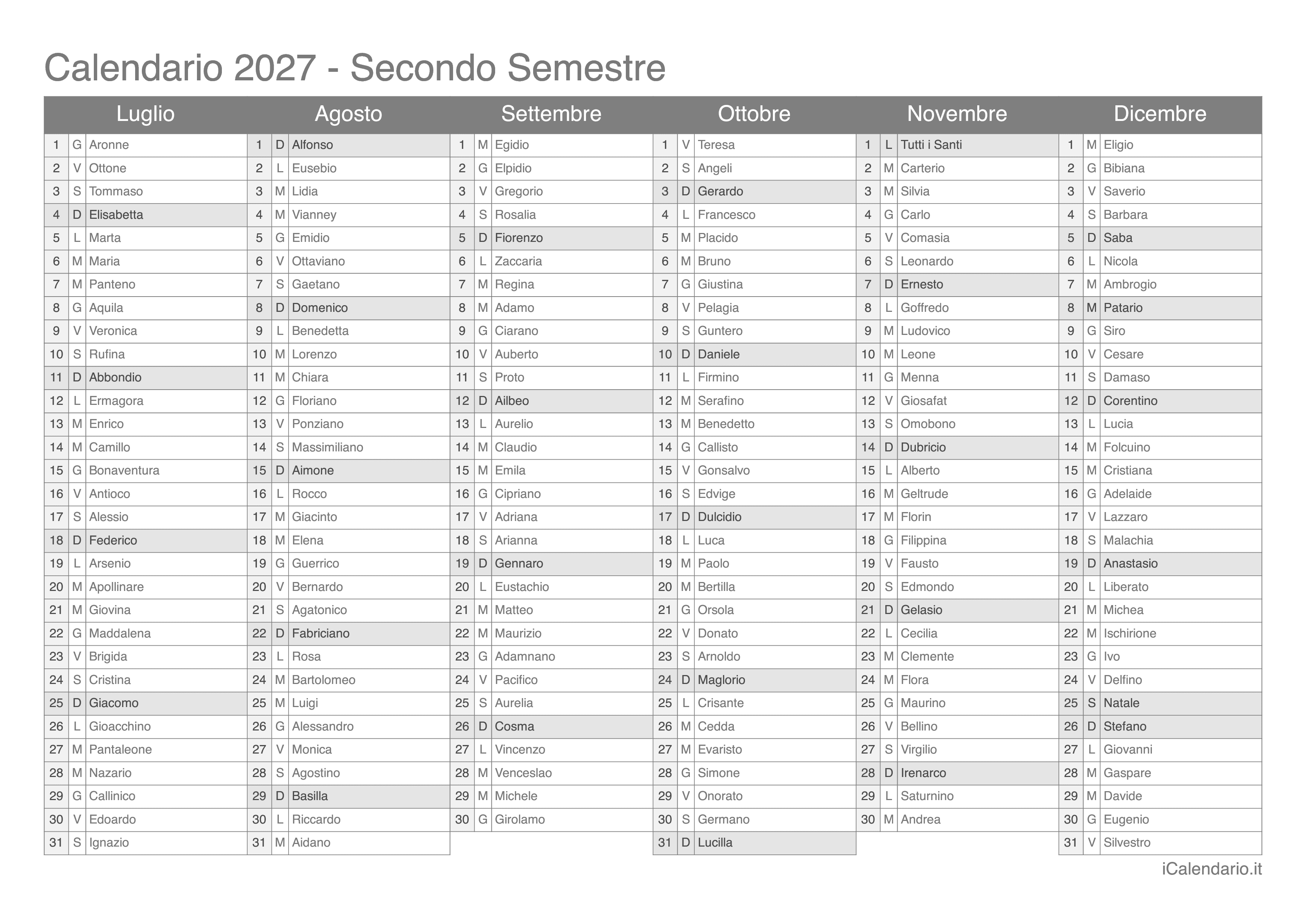 Calendario semestrale 2027