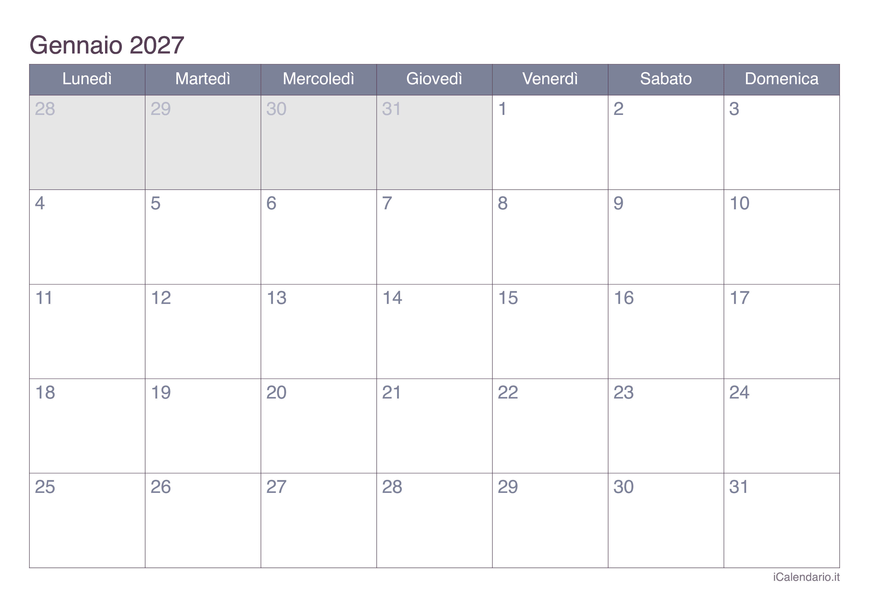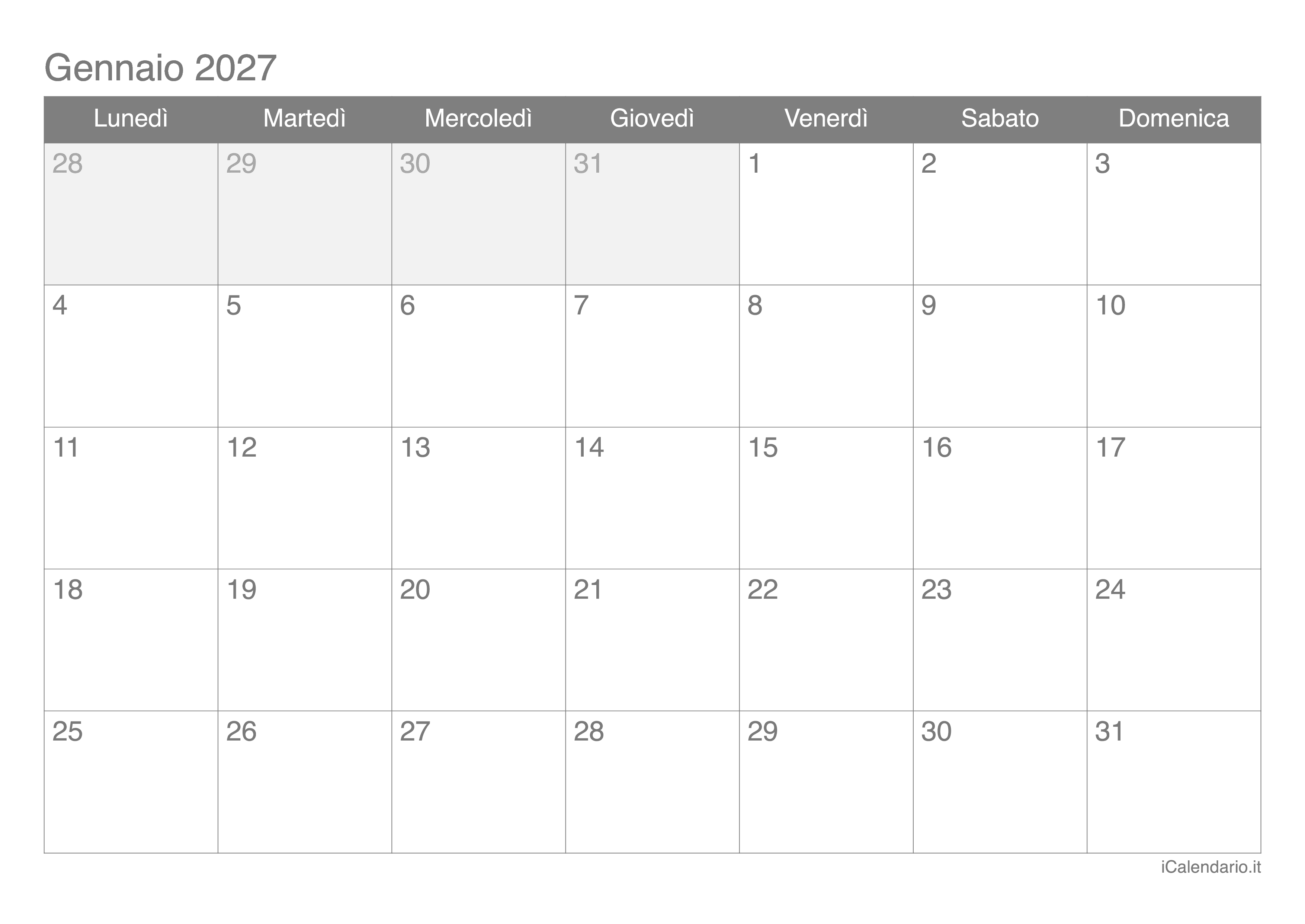 Puoi scaricare e stampare gratuitamente il calendario di gennaio 2027 in diversi formati: immagine, PDF e Excel. Trovi anche altri temi del calendario 2027 per il mese di gennaio.