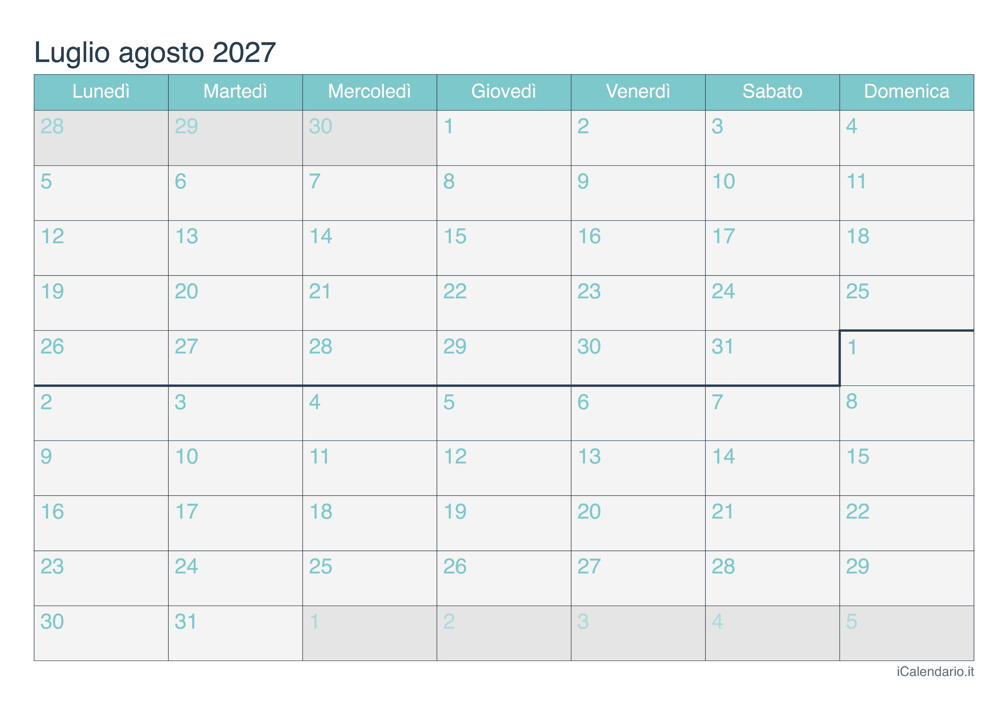 Puoi liberamente scaricare e stampare il calendario in bianco di luglio y agosto 2027 in formato immagine, PDF e Excel. Potrai anche trovare altri temi del calendario 2027 per il mese di luglio y agosto.