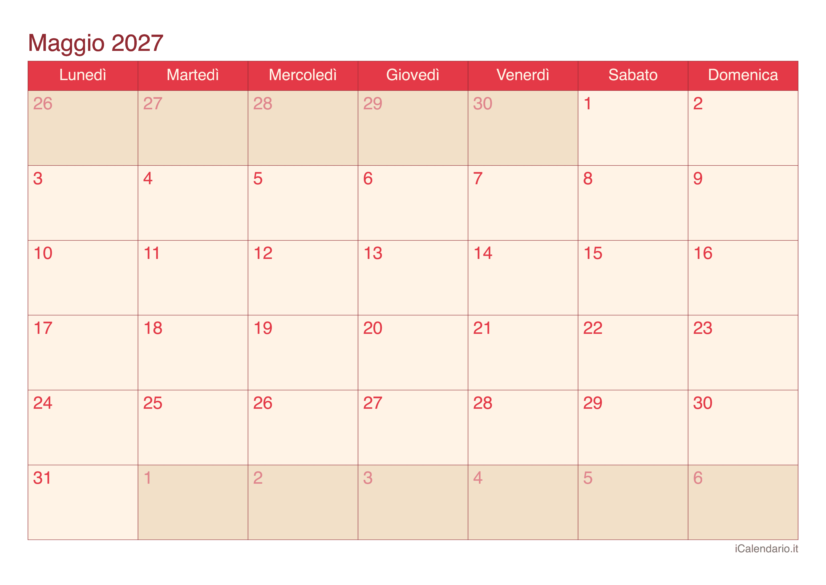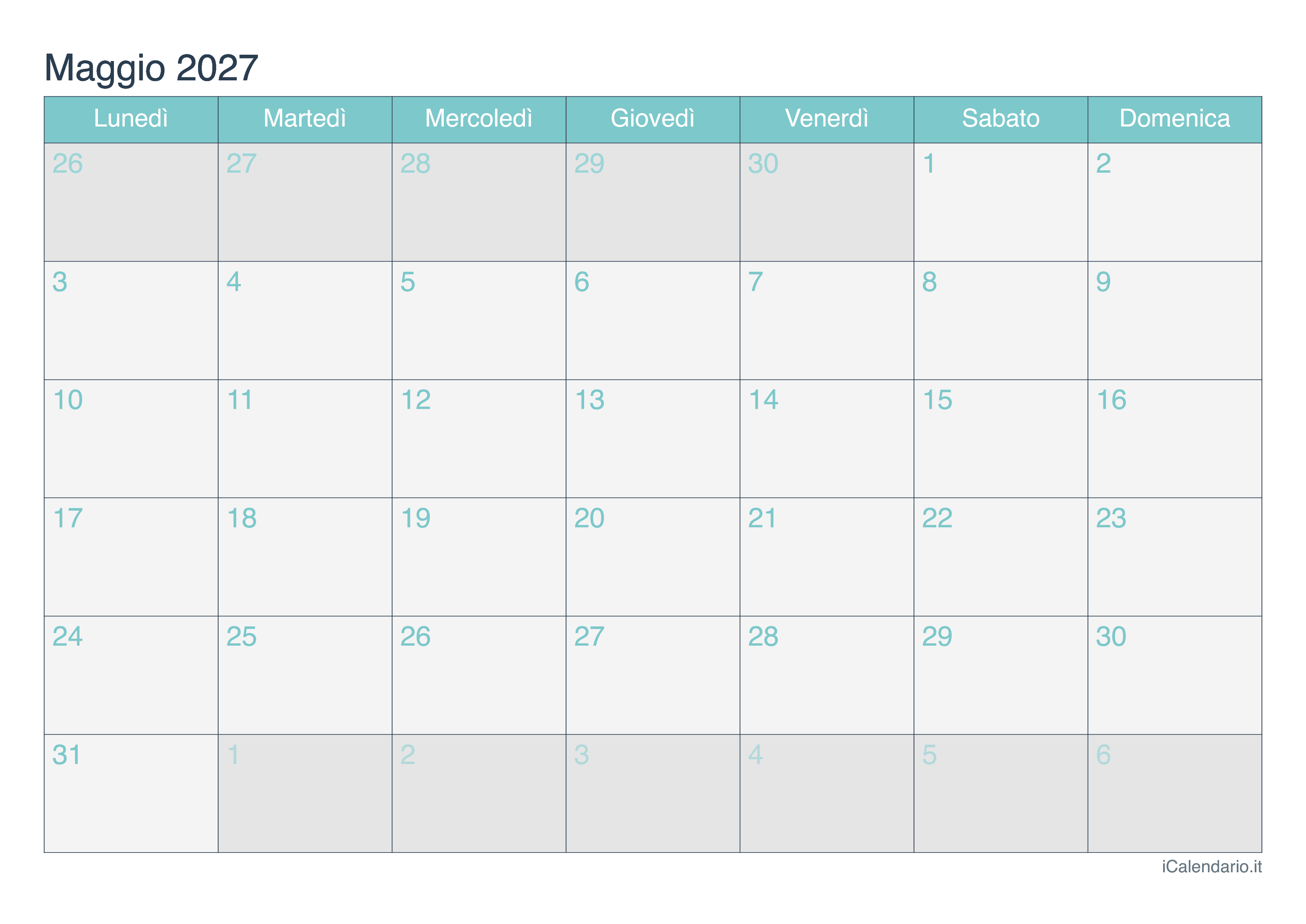 Puoi liberamente scaricare e stampare il calendario in bianco di maggio 2027 in formato immagine, PDF e Excel. Potrai anche trovare altri temi del calendario 2027 per il mese di maggio.