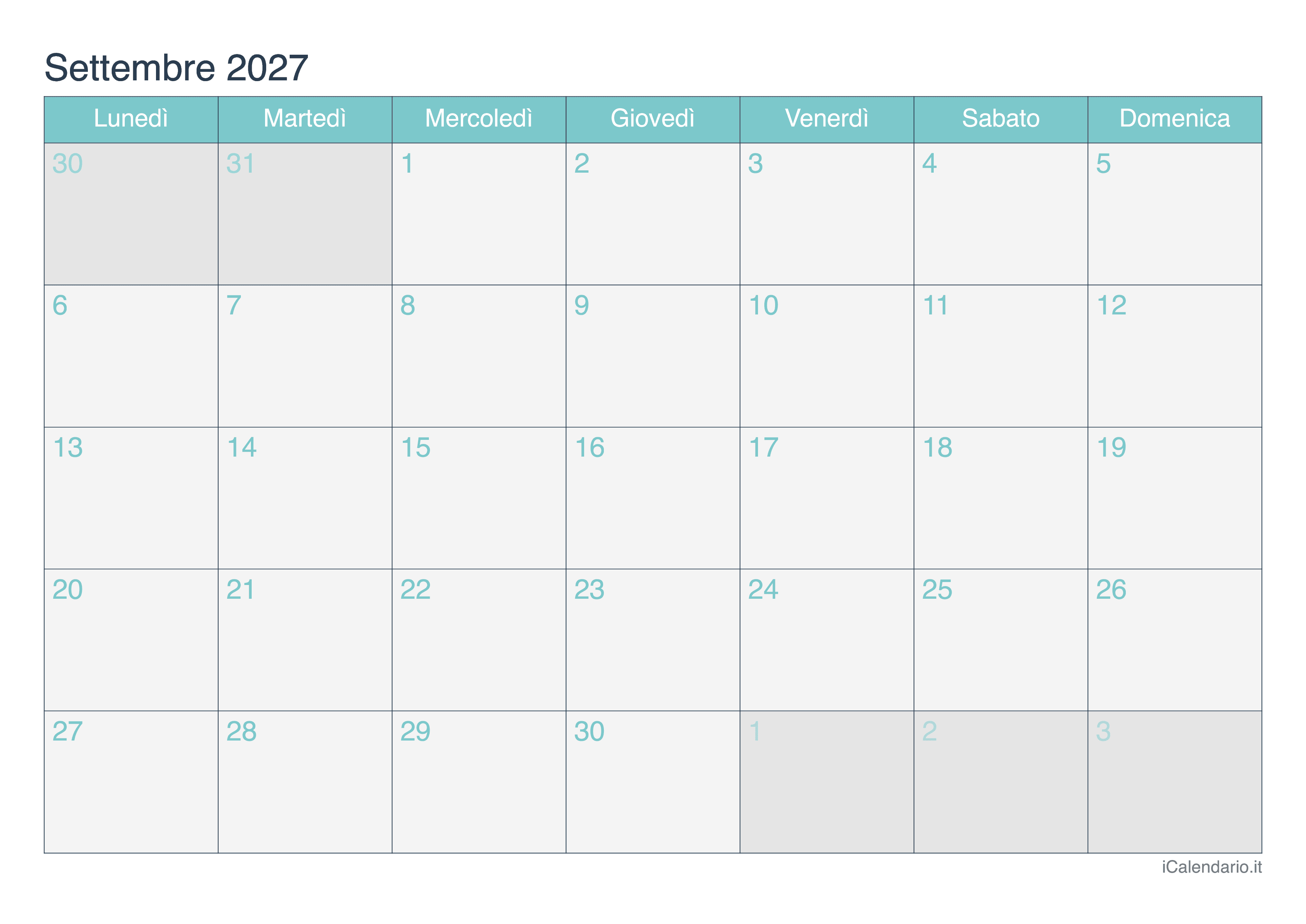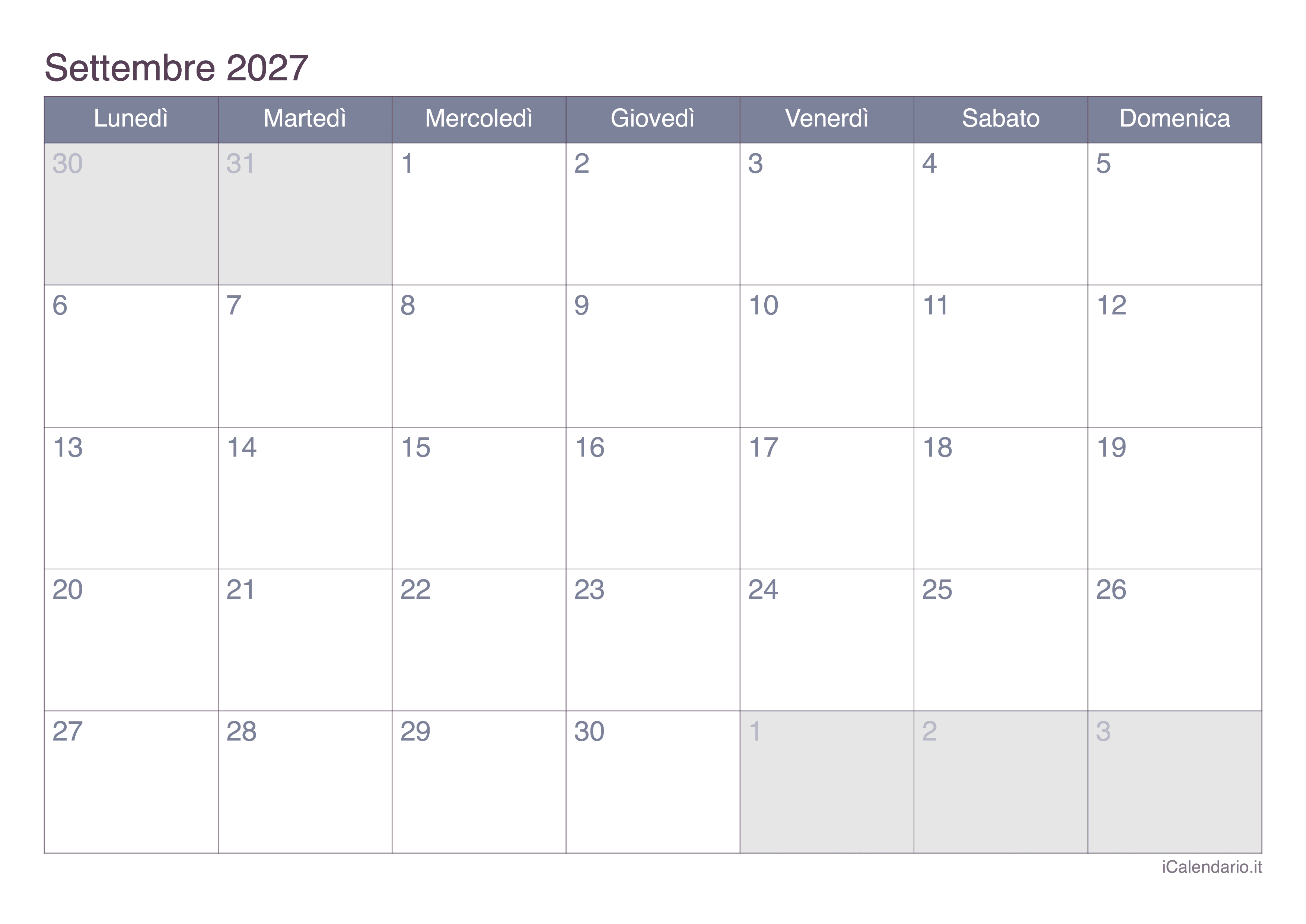Calendario di settembre 2027 stampabile